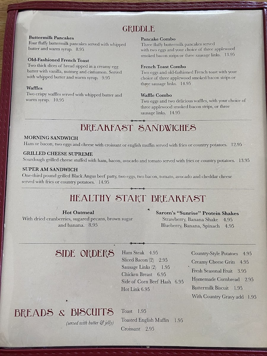 Two thick slices of bread sipped in a creamy egg batter with vanilla, nutmeg and cinnamon. Served with whipped butter and warm syrup.
